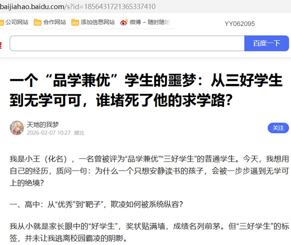 我是小王(化名),一名曾被评为“品学兼优”“三好学生”的普通学生。今天,我想用自己的经历,质问一句:为什么一个只想安静读书的孩子,会被一步步逼到无学可上的绝境?